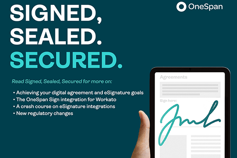 The OneSpan Sign integration for Workato helps non-technical teams embed the OneSpan Sign eSignature platform directly into 1000+ enterprise applications like Salesforce, SharePoint, Workday, ServiceNow, and more. The integration is already available in the Workato Marketplace for all licensed Workato users. Learn more about the integration here.